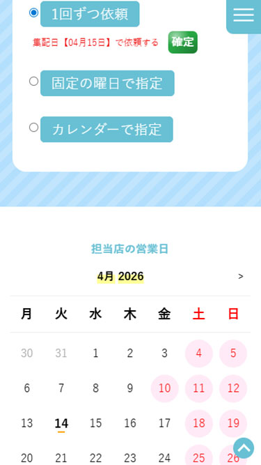 ※ページ下部にある営業日カレンダーにて指定した曜日が店舗休業日だった場合、集配は行えませんので、「カレンダーで指定」等で調整してください。