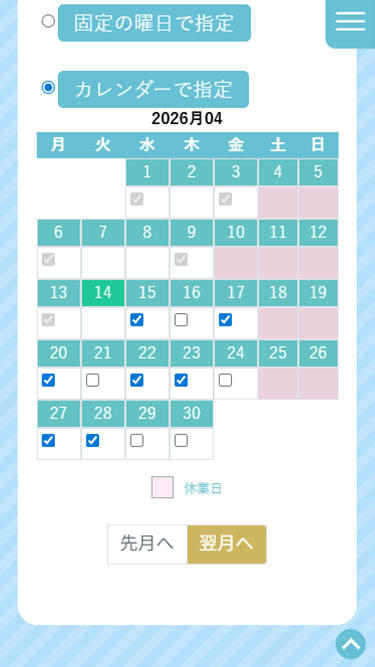 1)カレンダー設定:4/1、4/2、4/8、4/9、4/15、4/16、4/22、4/23、4/29、4/30にチェック